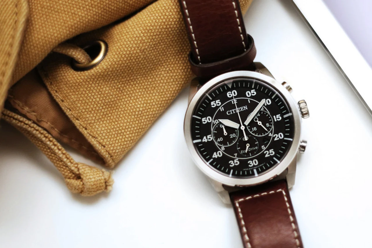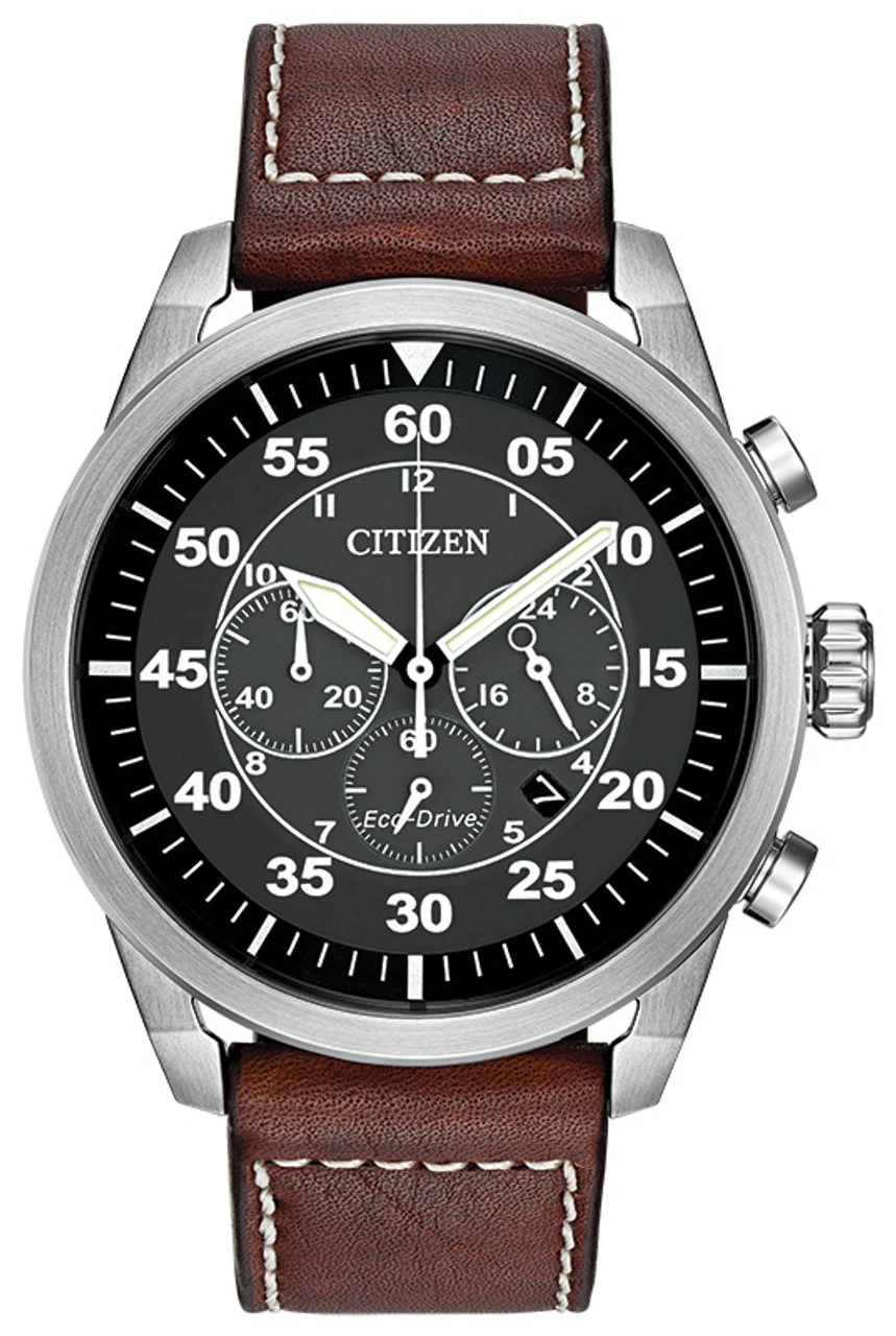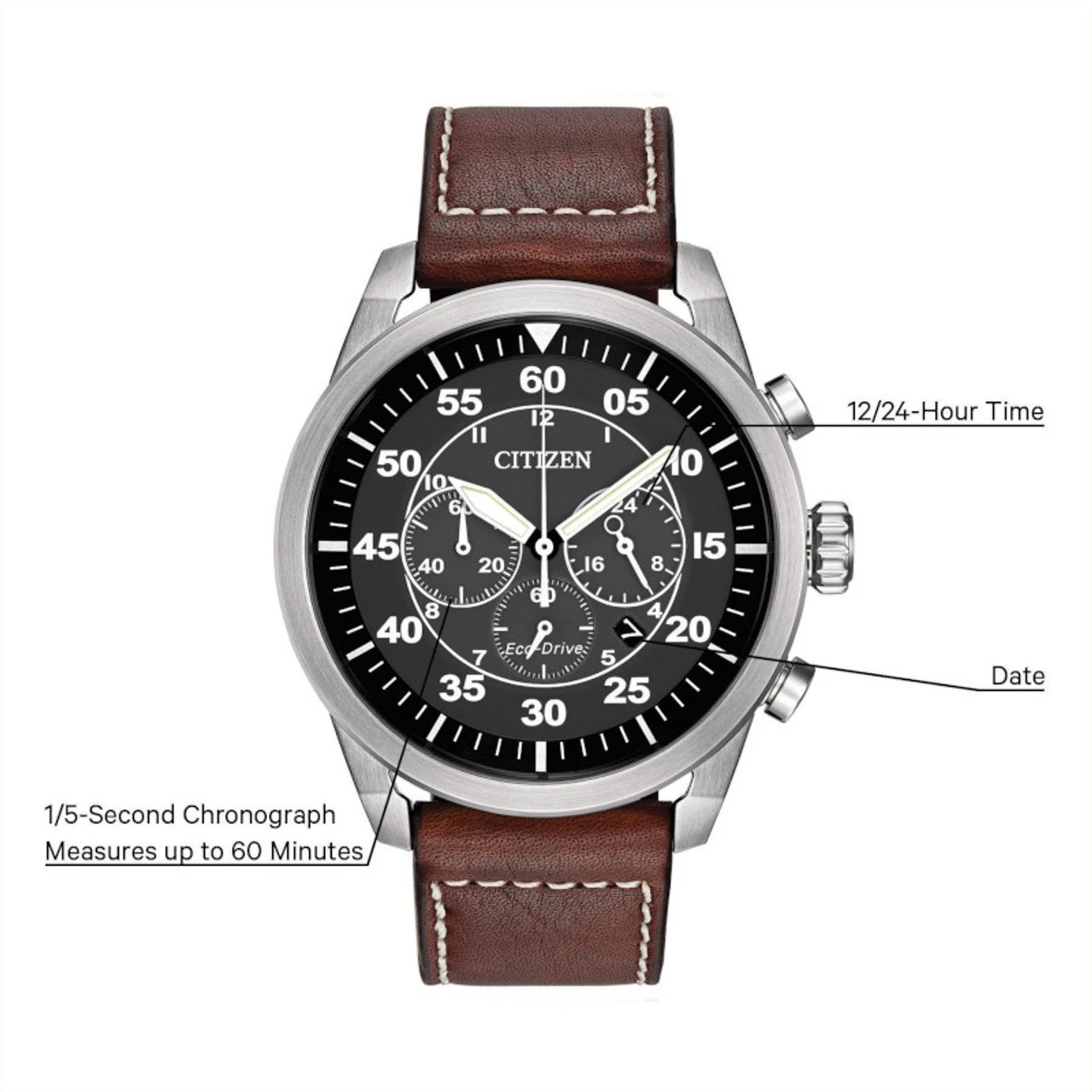 Citizen’s Avion is a vintage-inspired timepiece reminiscent of transatlantic flights from the 1950’s. Design cues taken from the golden age of travel include the rich brown leather strap with contrast stitching, luminous markers and classic date function. In a stainless steel case with black dial this timepiece now has the added 1/5th-second chronograph and 12/24-hour time features. Featuring our Eco-Drive technology – powered by light, any light. Never needs a battery. Caliber number B620.