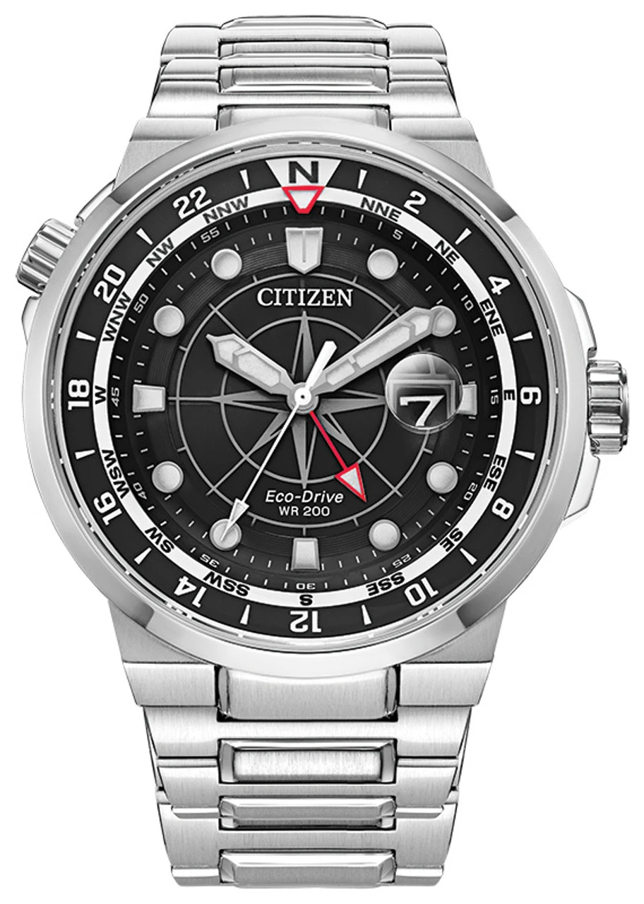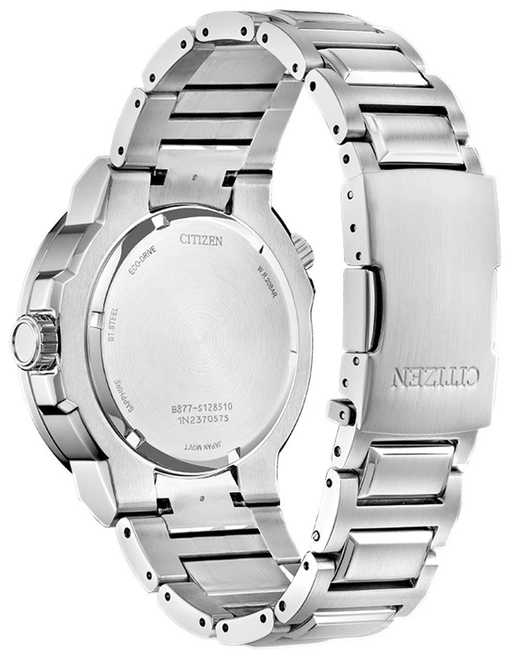 Venture into our sport luxury collection with the Endeavor timepiece for next level style and function. The updated design in silver-tone stainless steel features a 3-hand black dial with a dual time zone and magnified date, luminous hands and markers, and an anti-reflective sapphire crystal. This timepiece also features a fold-over clasp closure with hidden push buttons and is water resistant to 200 meters. For a men’s watch that makes a standout style statement, the Endeavor is the perfect choice. Featuring our Eco-Drive technology – sustainably powered by any light and never needs a battery. Caliber number B877.