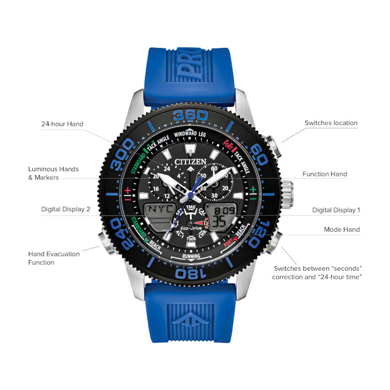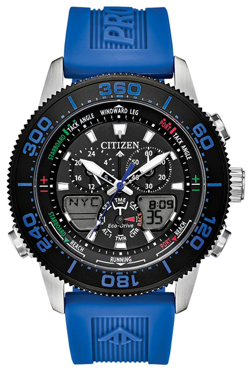 For avid marine sportsmen who value style as much as function, Citizen’s Promaster Sailhawk with Eco-Drive technology is the perfect combination of the two. With a blue polyurethane strap and numbering detail, offset with a stainless steel case, black aluminum bezel and dial, this watch isn’t blending into the background. And with features such as a yacht racing timer, a 99-minute countdown timer, two separate alarms, split lap times, the ability to show the time in 30 cities worldwide, and water resistance up to 200 meters, there is no water-based activity this timepiece can’t handle with ease.