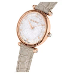 This spellbinding timepiece wonderfully captures the dazzling spirit of the Crystalline Wonder family. Crafted with a rose gold-tone finish, the 35mm case features uniquely shaped attachments with a single clear stone in each end, along with another stone placed in the crown. Under the domed glass, the watch’s dial is beautifully embellished with Arabic numerals and approximately 1000 crystals for an astonishing effect. Swiss made and water-resistant to 50m, this wondrous timepiece is presented on a quick release Italian calf-skin leather strap in beige, which is embossed with a lizard pattern. A striking choice for your everyday style, or a timeless gift for a loved one.